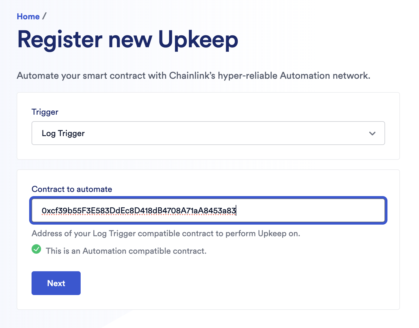 1. Provide the address of your Automation-compatible contract that you want to automate. In this case, we will paste the address of CountWithLog.sol. This contract must follow the format of the ILogAutomation interface to ensure Automation nodes can interact with your contract as expected.